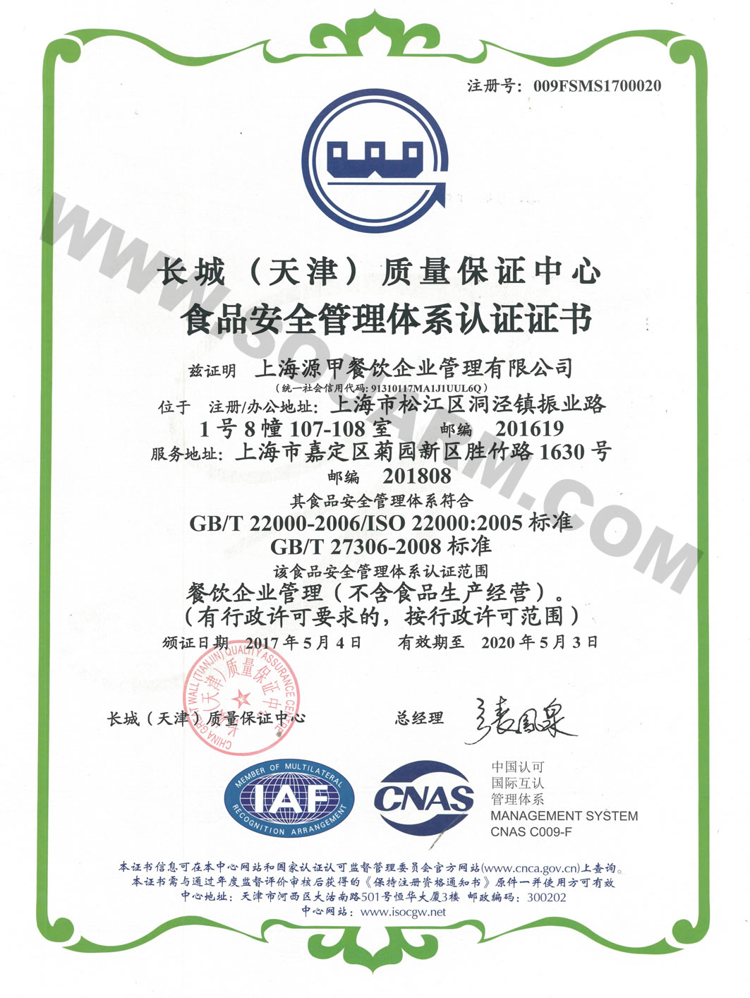 ISO22000食品安全管理體系認(rèn)證證書(shū)