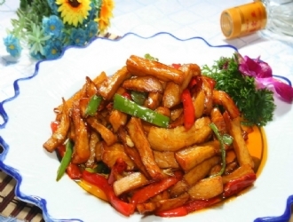 炒鍋上火,加入花生油燒熱,放蔥絲爆鍋,加入干辣椒炒香,再加入青紅椒絲、土豆絲,炒至八成熟時加入精鹽、味精調(diào) 味,再淋上香油和香醋,炒熟即可。